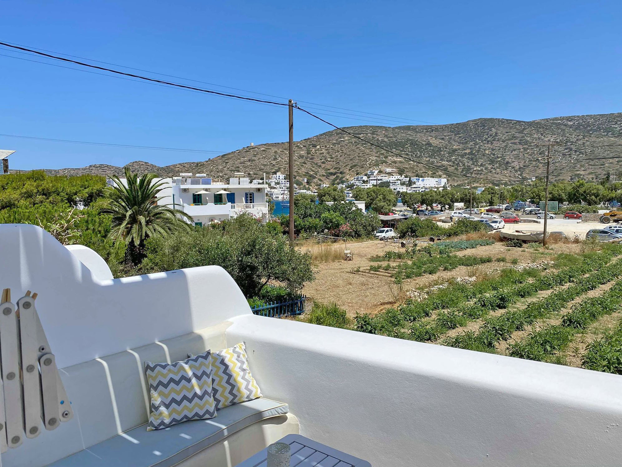 The apartment is located on the ground floor and has a balcony with a partial view of the port of Katapola.